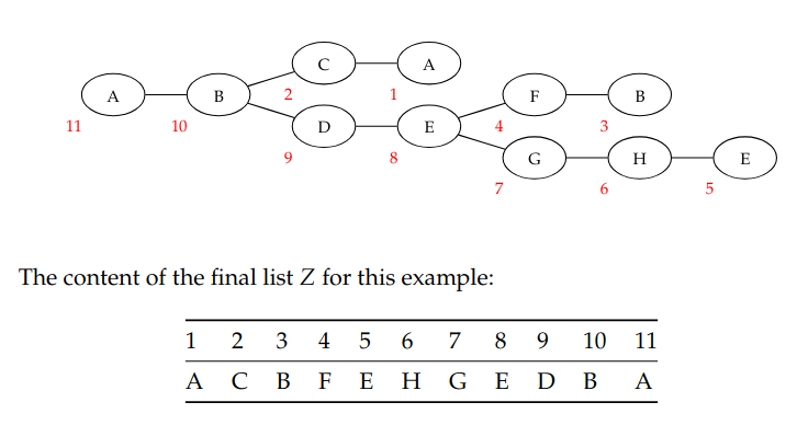 walk(v)We start at , walking . Every edge gets marked once, as we check before marking. The walk ends in a vertex such that all incident edges are marked (as we only stop once there are no more incident edges).
