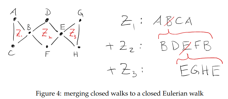 Assume ends in . Before the walk ALL-EVEN held, and thus had an even number of unmarked edges. After running walk(u) now has no unmarked edges, as the walk ends there. Hence is even. Thus walk(u) marked a walk , as all vertices have an even number of edges in the walk.