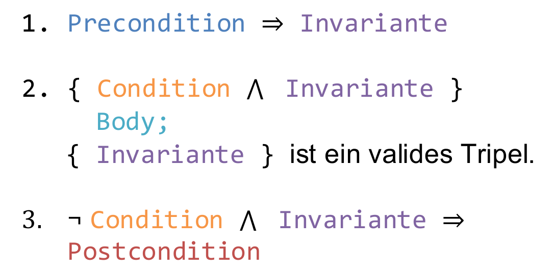 Wir müssen eine Invariante finden, die diese Bedingungen erfüllt. Diese wird sehr oft anhand der Postcondition zu finden sein.