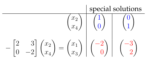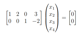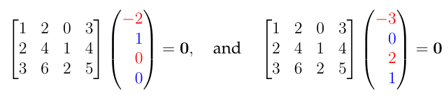 This gives us a basis of the nullspace as we get two linearly independent vectors in there and it has dimension 2. We call these particular solutions.