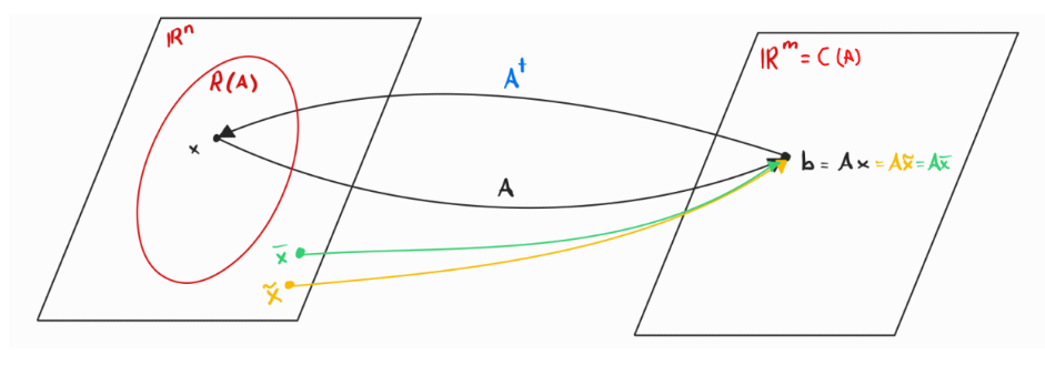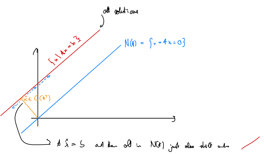 Since for full row rank there are many possible solutions, the pseudoinverse is choosing the one with the smallest norm such that . Since each solution is with and , the pseudoinverse chooses an with no nullspace component to get the smallest norm. Notice the at the front of the definition. This means that is in the row-space: exactly what we want!