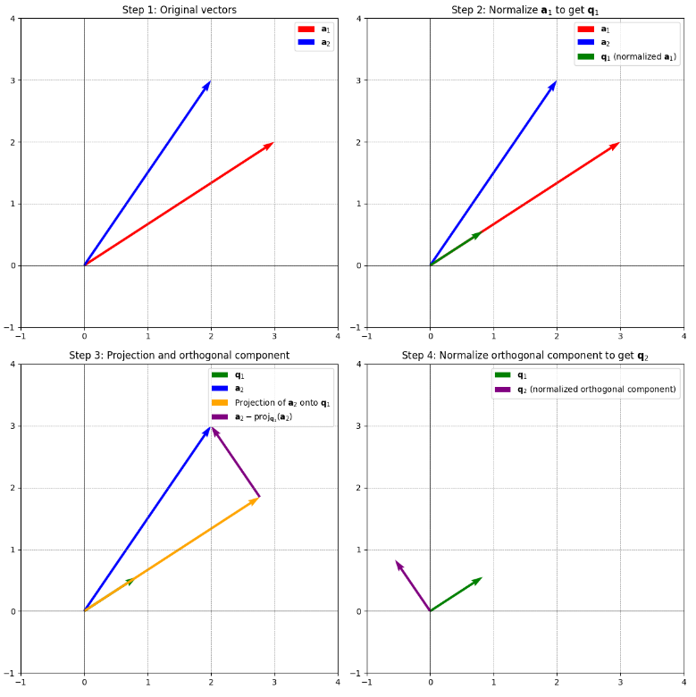 - For set \begin{align*} q'_k =& a_k - \sum_{i = 1}^{k - 1} (a_k^\top q_i)q_i \\ q_k =& \frac{q_k'}{||q'_k} \end{align*} Linearly dependent case (not in lecture) (i.e. the vectors don’t form a basis) Since in a linearly dependent set of vectors one of them is a linear combination of the previous ones, you’d get in the subtraction step for it. By excluding those ‘s you’d still get an orthonormal basis.