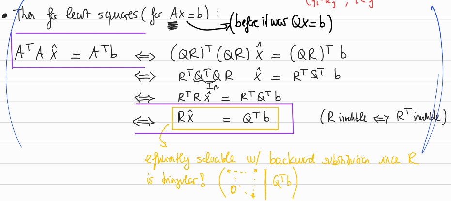 - The least squares solution to denoted is defined as a solution of the normal equations Furthermore and thus Since is invertible we can simplify this to which can efficiently be solved by back substitution since is a triangular matrix.