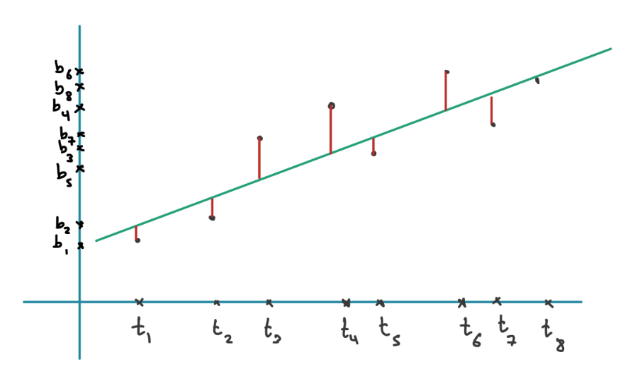 The line here can be represented by the equation . We want to find and that minimise the sum of squares of the error of the fitted line: which in Matrix vector notation gives where and