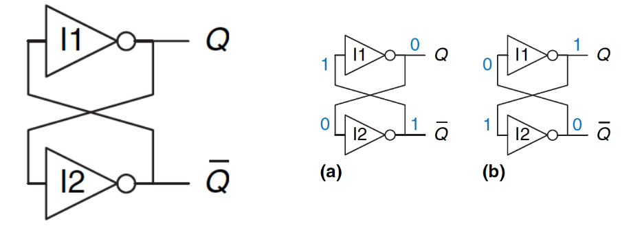The cross-coupled inverters have two stable states: or . There is also a “metastable” state, in which they oscillate between and .