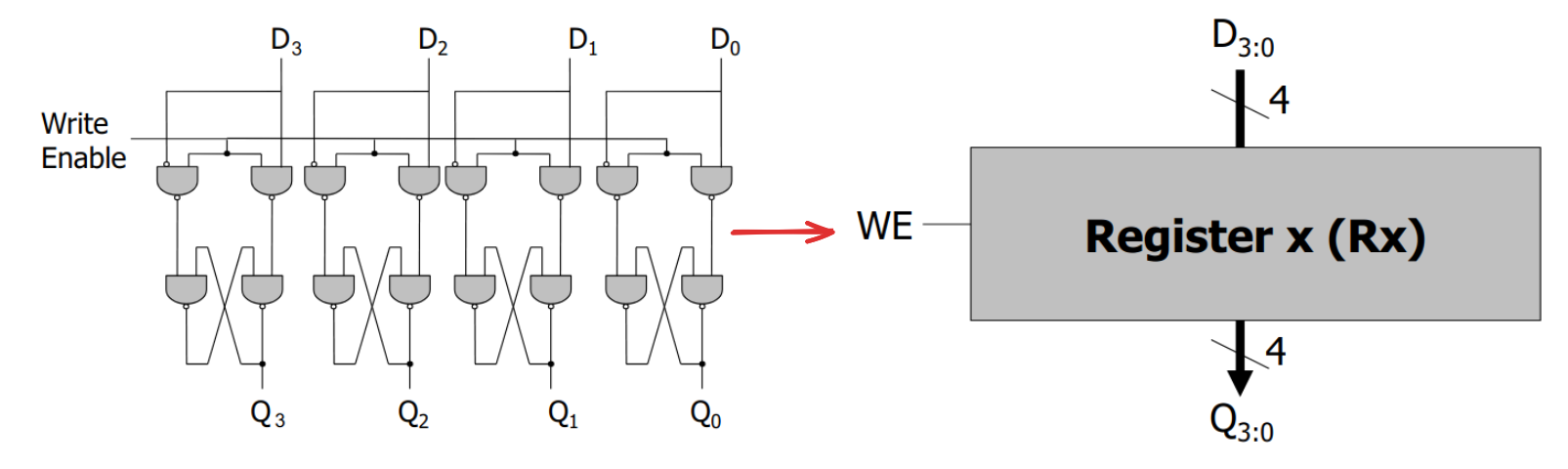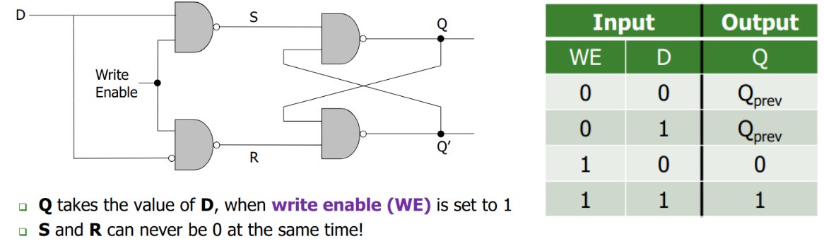 - WE = 1: The latch becomes transparent; Q takes on the value of D (Q = D).